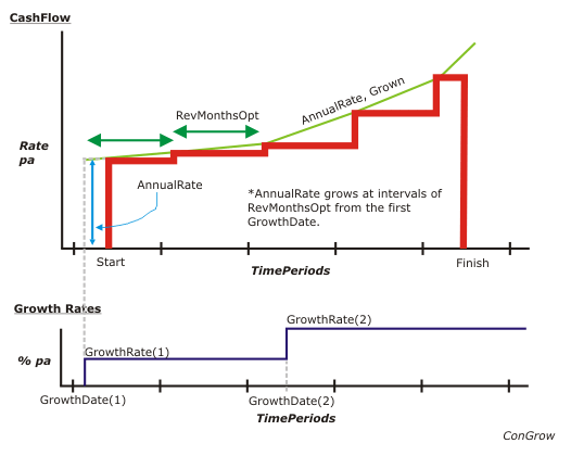 | ConGrow (Time, Base, Start, Finish, AnnualRate, GrowthDates, GrowthRates, [RevMonthsOpt], [DayCount], [Periods], [ProjMode]) | ||||||||