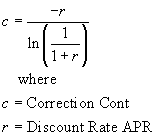 | Correction Factor to multiply an NPV for annually spaced cashflows to convert to cashflows spaced continuously throughout the year | ||||||||