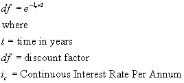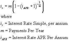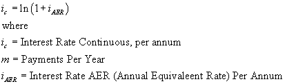 | Key Terms: To convert Simple Interest Rates to AER ![]() This formula is used in the function SimpleToAER. To convert AER to Simple Interest ![]() This formula is used in the function AERToSimple. To convert Simple Interest to Continuous ![]() This formula is used in the function SimpleToCont. To Convert Continuous to Simple ![]() This formula is used in the function ContToSimple. To convert AER to Continuous: ![]() This formula is used in the function AERToCont. To convert Continuous to AER ![]() This formula is used in the function ContToAER. To convert an AER to a Discount Factor ![]() This formula is used in the function AERToDF. To convert a Discount Factor to an AER ![]() This formula is used in the function DFToAER. To convert a Continuous rate to a Discount Factor ![]() This formula is used in the function ContToDF. To convert a Discount Factor to a Continuous Rate ![]() This formula is used in the function DFToCont. To convert a Simple rate to a Discount Factor ![]() This formula is used in the function SimpleToDF. To convert a Discount Factor to a Simple Rate ![]() This formula is used in the function DFToSimple. |