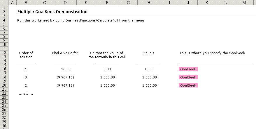 | Simple demonstration of Business Functions multiiple GoalSeek using the GoalSeek function and CalculateFull | |