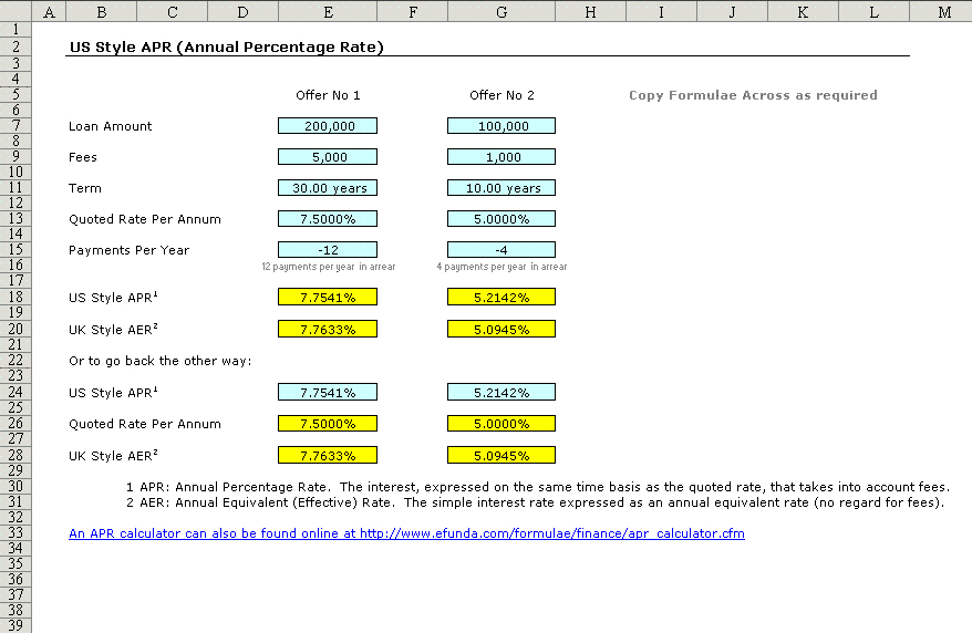 | Very simple spreadsheet converts Interest Rates from a Quoted Rate to a US style APR and, if necessary, back again. Also shows UK style AER for comparison. | |